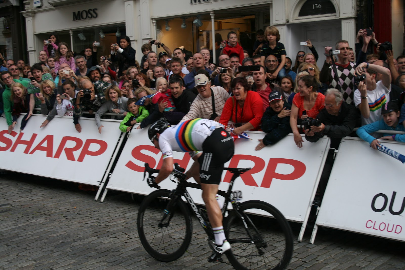 The third picture show the overall winner of the Tour Jon Tiernen-Locke, the new star of British cycling, finishing in the midst of the peleton in the Golden Jersey. In his post race interview Cav said that he was desperate to win in Guildford, after the disappointment of the Olympic Road race and as this was his last race in the coveted world champion’s Rainbow Jersey. He goes to Maastricht in Holland next weekend to defend his World Championship road race title, with the cream of British cycling in his team, including Bradley Wiggins, Chris Froome and Jon Tiernen-Locke.